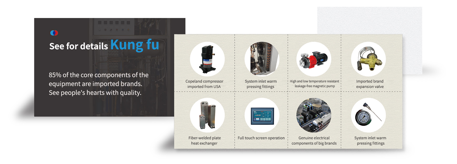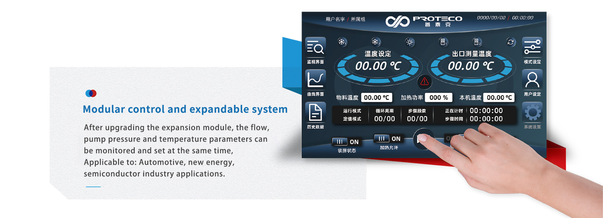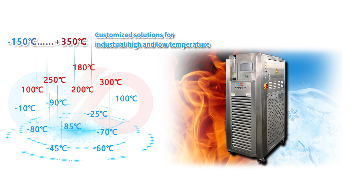 It mainly consists of refrigeration system, circulation system, control system, box, etc. The refrigeration system adopts steam compression refrigeration, and the compressor and main refrigeration components are all from internationally renowned brands. The circulation system consists of a circulation pump, a cold storage container, an exhaust valve, a one-way valve, a thermal resistor, pipelines, etc. The control system adopts PID control technology, high-definition touch screen display, and is equipped with multiple protection functions to ensure the safe operation of the equipment. By cooling and heating the unit itself, the heat carrying fluid is transported to the outside world to meet the requirements of the process conditions.